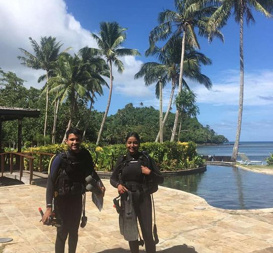 We stayed at Beqa Lagoon Resort and got straight into our classes with Kelly our dive master. Shane and I as beginners, were nervous at first but once we got into learning and the pool sessions, we were eager to master diving techniques. Mastering the techniques of diving requires all attention and focus. We were being our usual selfs and had fun at the same time (in all seriousness!).